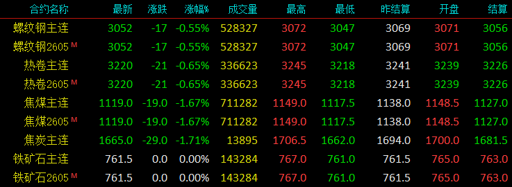 黑色系螺纹钢日度收盘跌17收报3052,期卷跌21收报3220,铁矿石稳收报761.5,焦煤跌19收报1119,焦炭跌29收报1665。螺纹钢成材盘面受市场弱现实压制,继续小幅回落,未见明显止跌信号,期货下方空间收窄,如何操作,联系分析师获取。