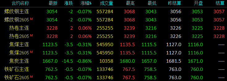 黑色系螺纹钢日度收盘跌2收报3054,期卷涨2收报3228,铁矿石跌0.5收报762.5,焦煤跌3.5收报1123.5,焦炭跌14.5收报1667。螺纹钢成材盘面受多空资金减仓影响,冲高后小幅回落,未见明显止跌信号,日线基本仍在下行趋势中,那么接下来如何操作呢,联系分析师获取。